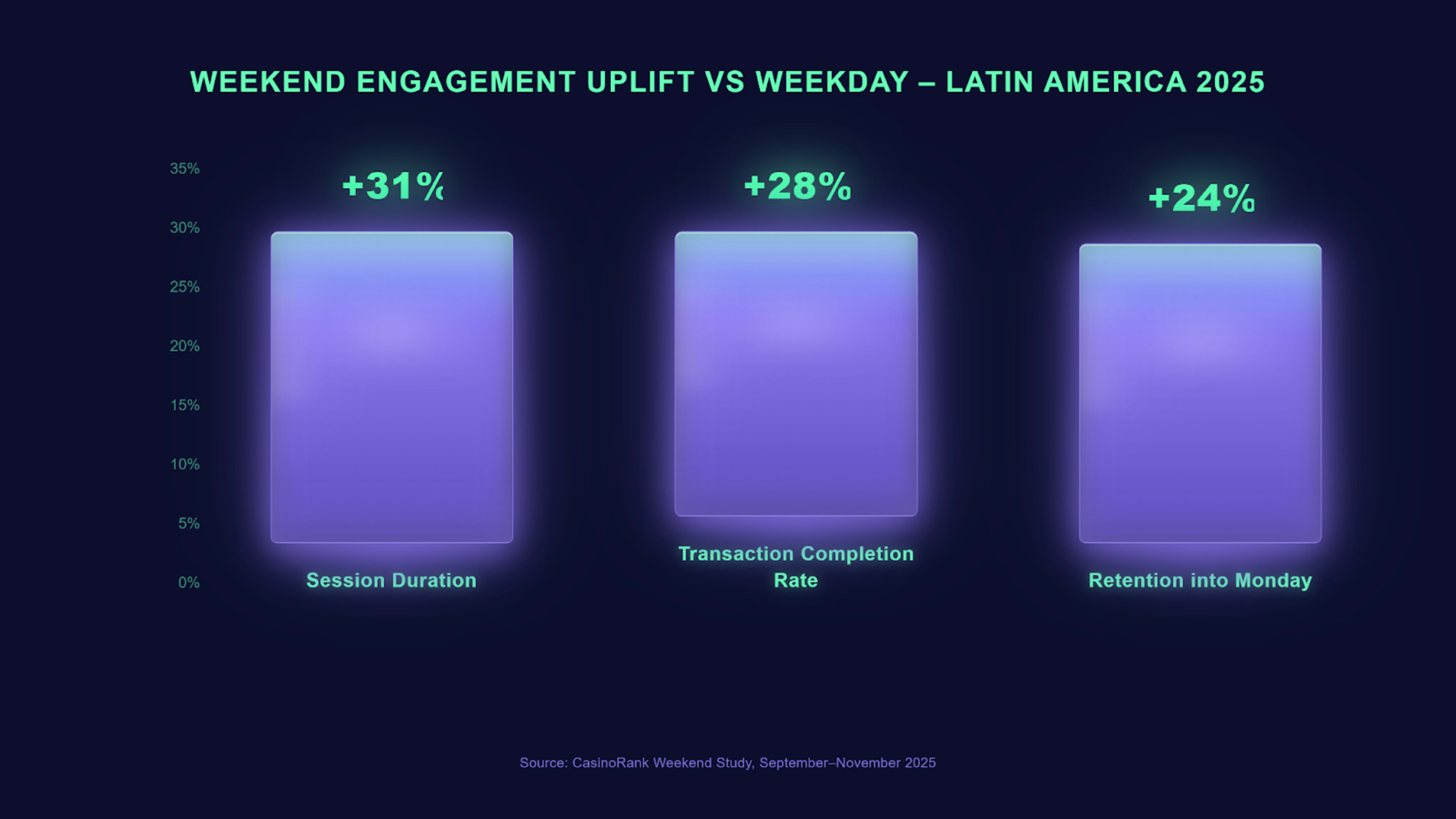 Weekend engagement metrics across Latin America showing session duration, transaction completion, and retention uplift compared with weekday activity.