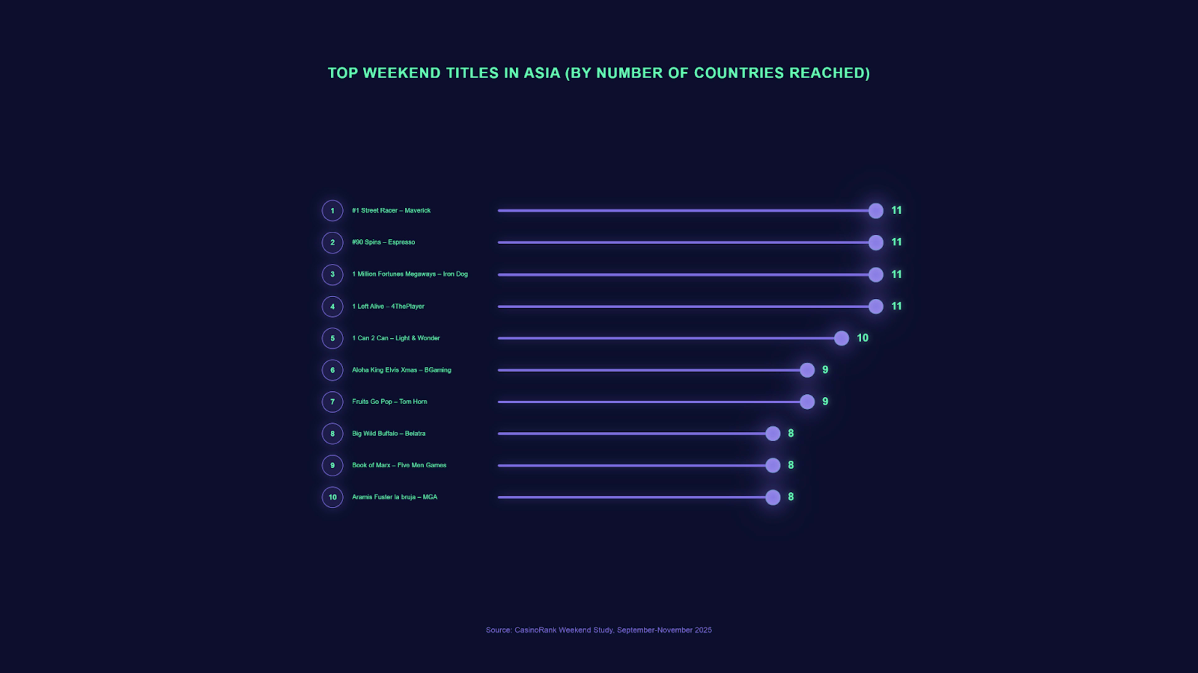 - Asia: 197 games from 84 providers were tracked across 11 countries during a single weekend window in November 2025. About 15% of these titles appeared in all 11 markets, a remarkable sign of regional alignment.