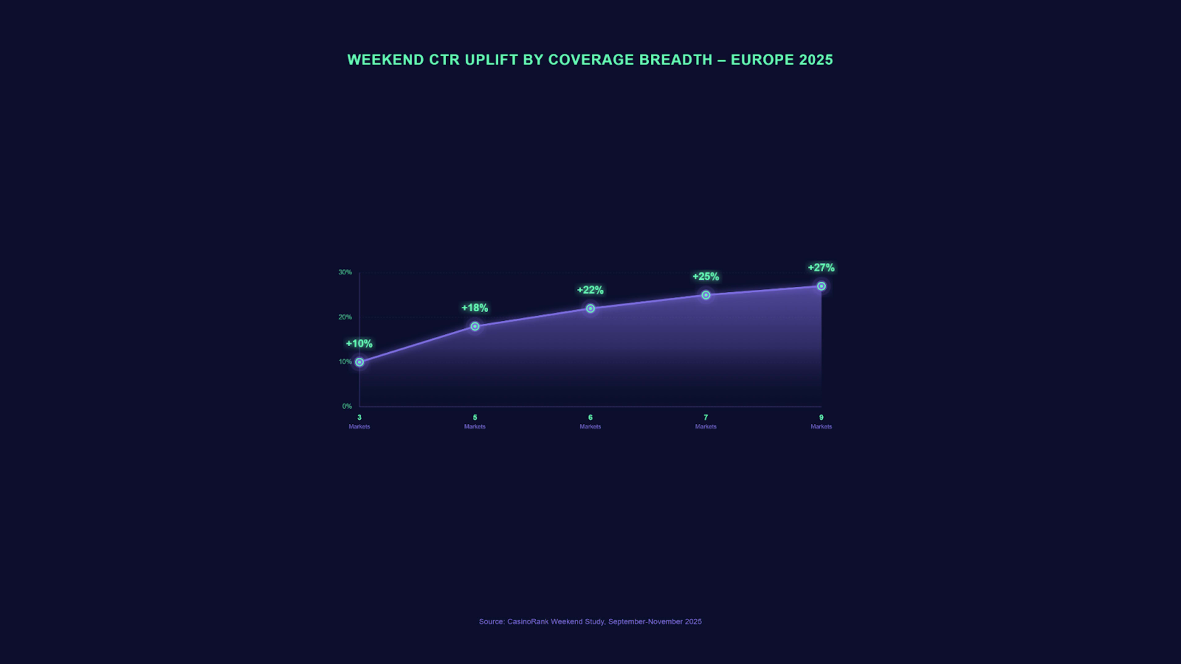 Operators treat these titles as weekend anchors — reliable, compliant, and instantly promotable. The data support this: games present in six or more markets enjoy a 27% higher click-through rate (CTR) on weekend banners compared to weekday campaigns.