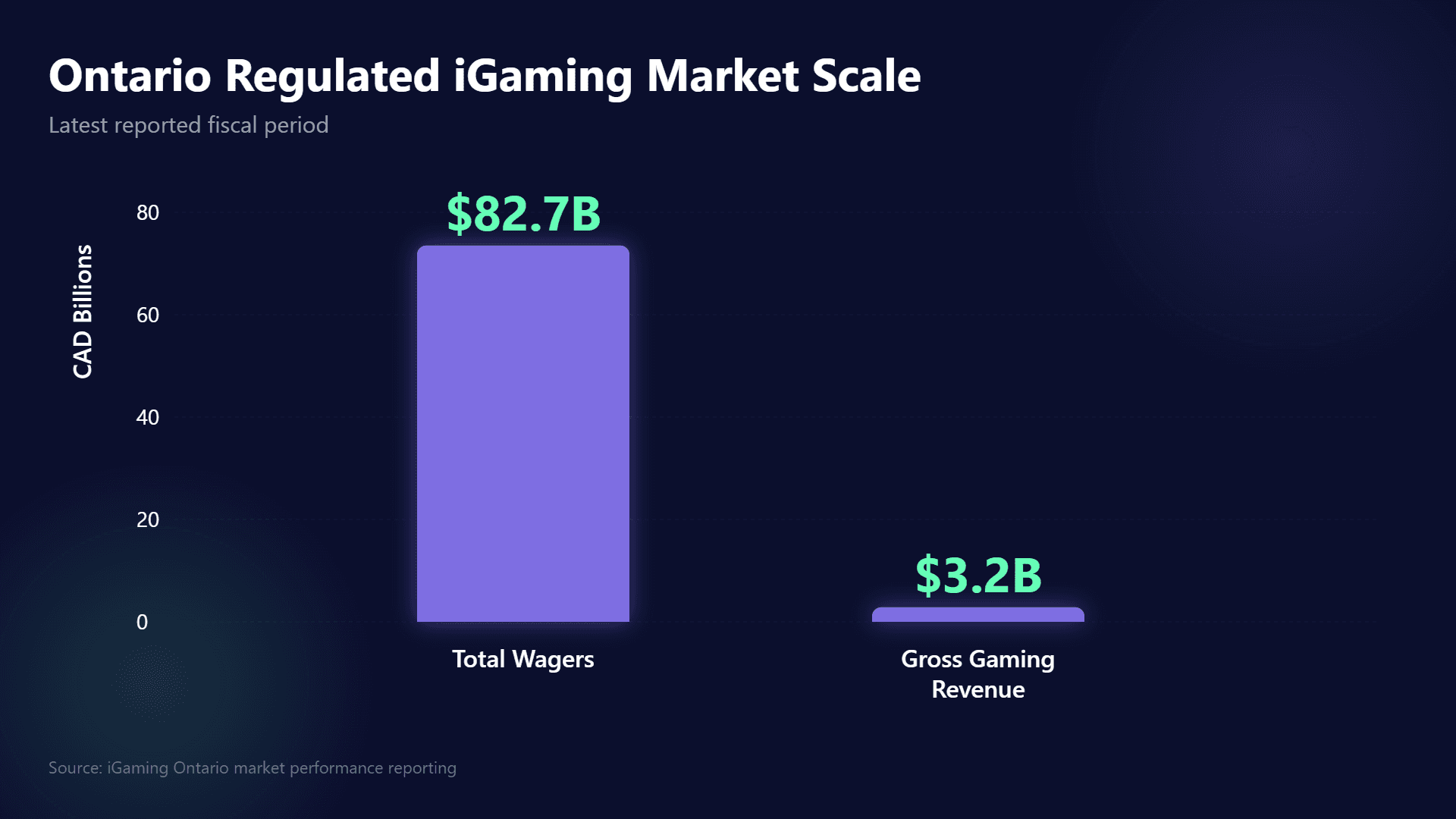 This chart illustrates the scale of Ontario’s regulated iGaming market, showing total wagers and gross gaming revenue for the latest reported fiscal period. The data demonstrates how a competitive regulated framework can operate at a significant scale while remaining under provincial oversight.