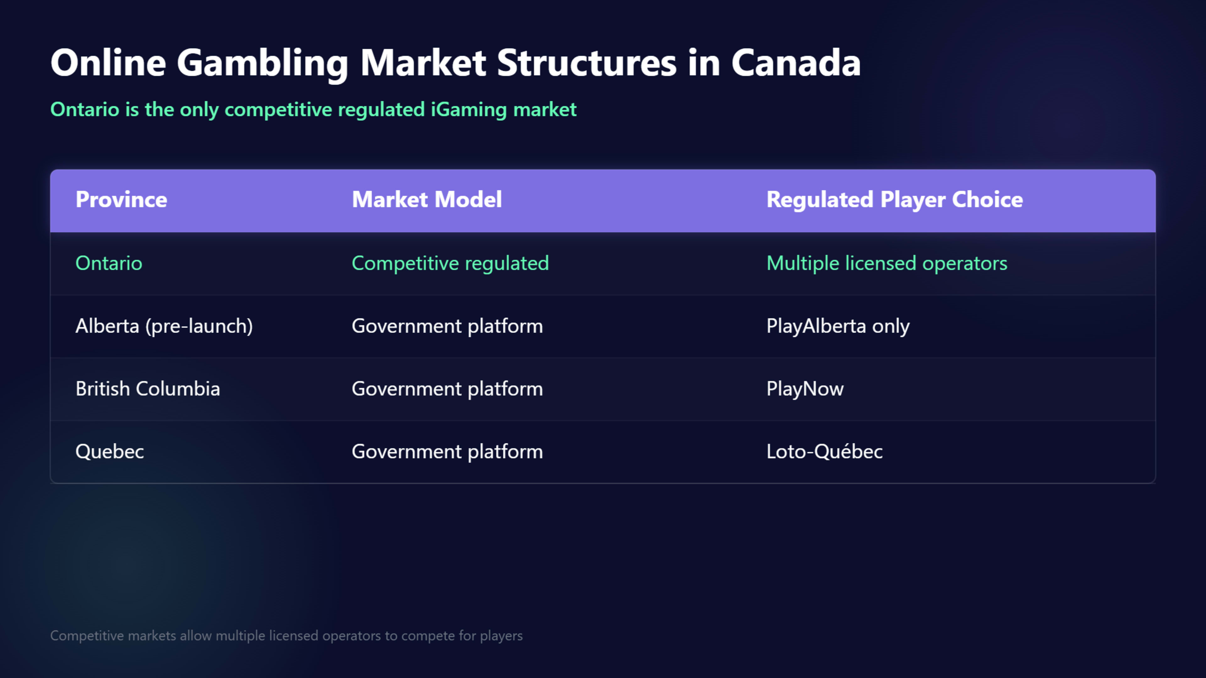 This table outlines the structural differences between Canadian online gambling models. Ontario is currently the only province with a competitive regulated iGaming market that licenses multiple private operators. Alberta, British Columbia, and Quebec operate government platform models, offering regulated access without internal market competition.
