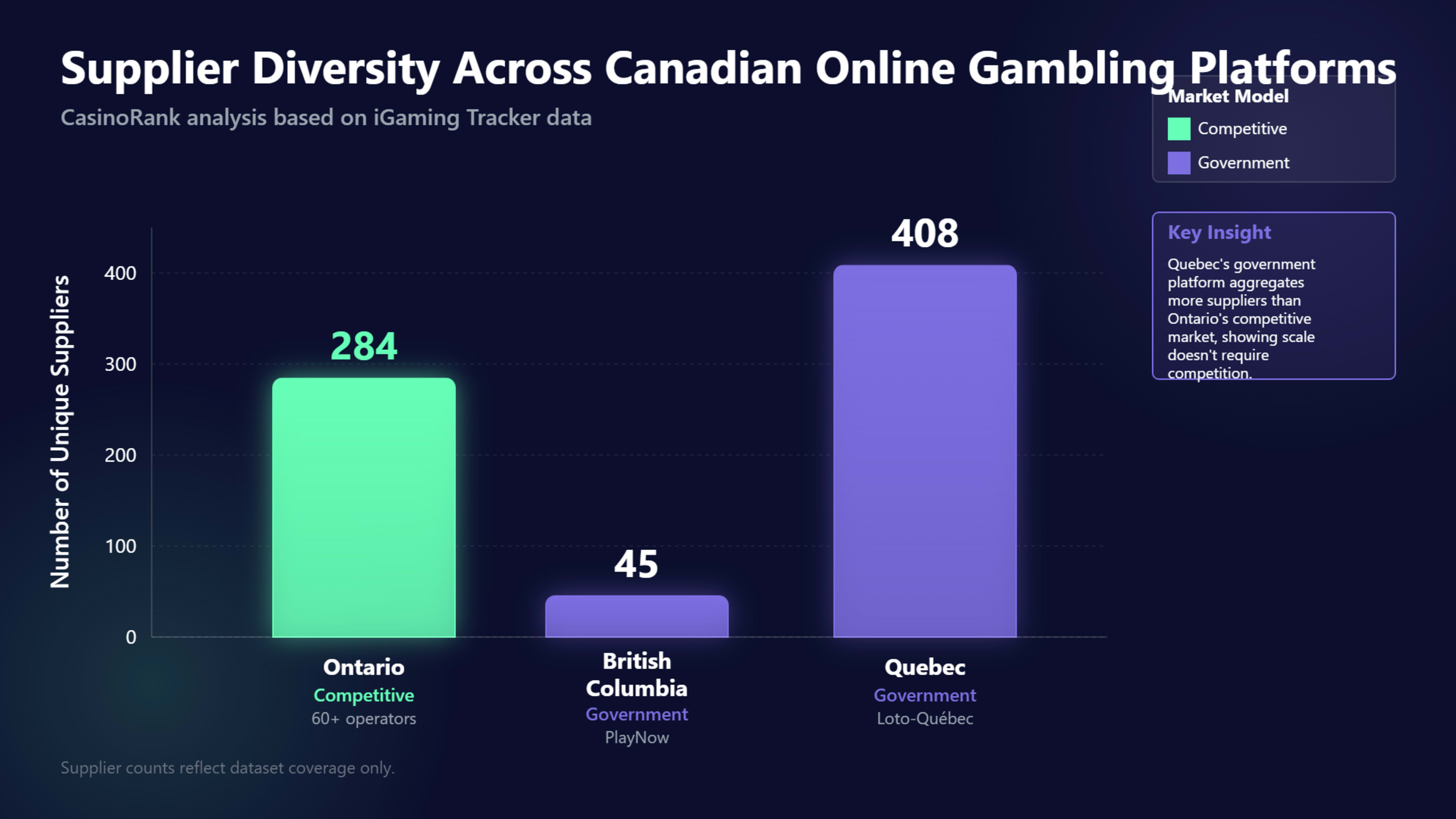 This chart compares the number of unique game suppliers available across Canadian online gambling platforms. Ontario, the only competitive regulated iGaming market, supports a broad supplier ecosystem, while British Columbia and Quebec operate government-run platforms with different aggregation models. Supplier counts reflect CasinoRank's analysis of iGaming Tracker data and indicate catalog structure rather than licensing status.
