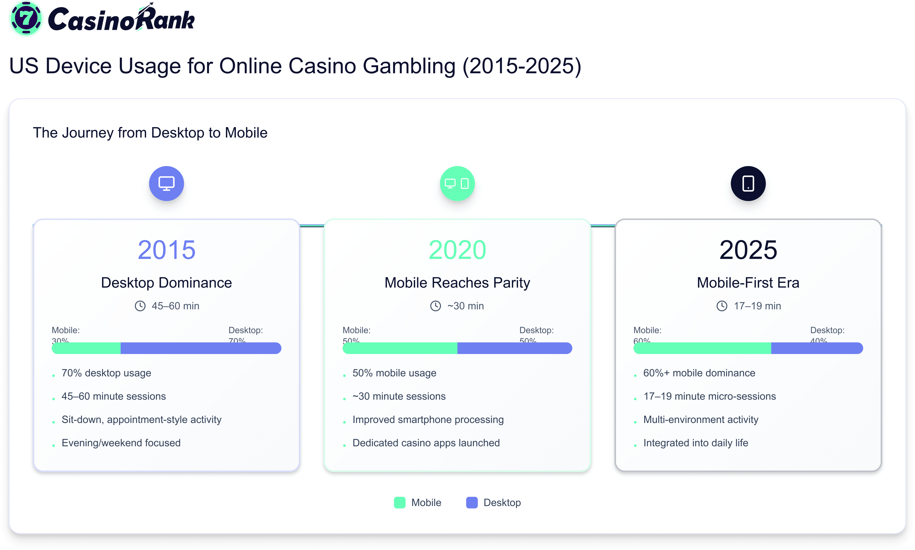 Back in 2015, roughly 70% of U.S. online casino players used desktop computers. Sessions typically lasted 45–60 minutes — similar to what gamblers might experience in a physical casino. These extended sessions were often reserved for evenings or weekends, and gambling felt more like a planned leisure activity rather than something spontaneous.