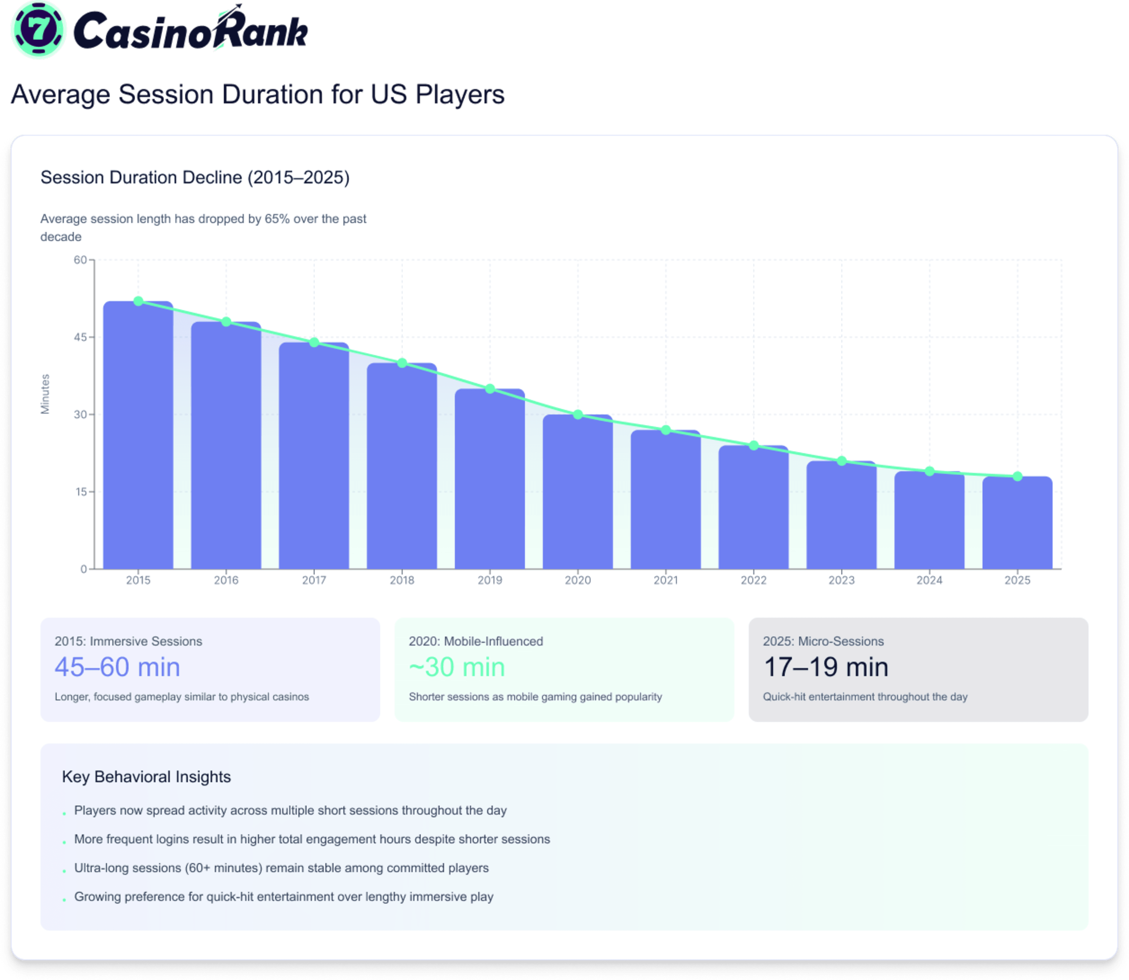 What’s driving the drop? Mobile convenience is a big factor — players log in when they have a few minutes to spare, instead of blocking off a full evening. Though long sessions (60+ minutes) haven’t disappeared entirely — loyal players still dive deep — the overall player base now includes far more casual users fitting gambling around daily life.