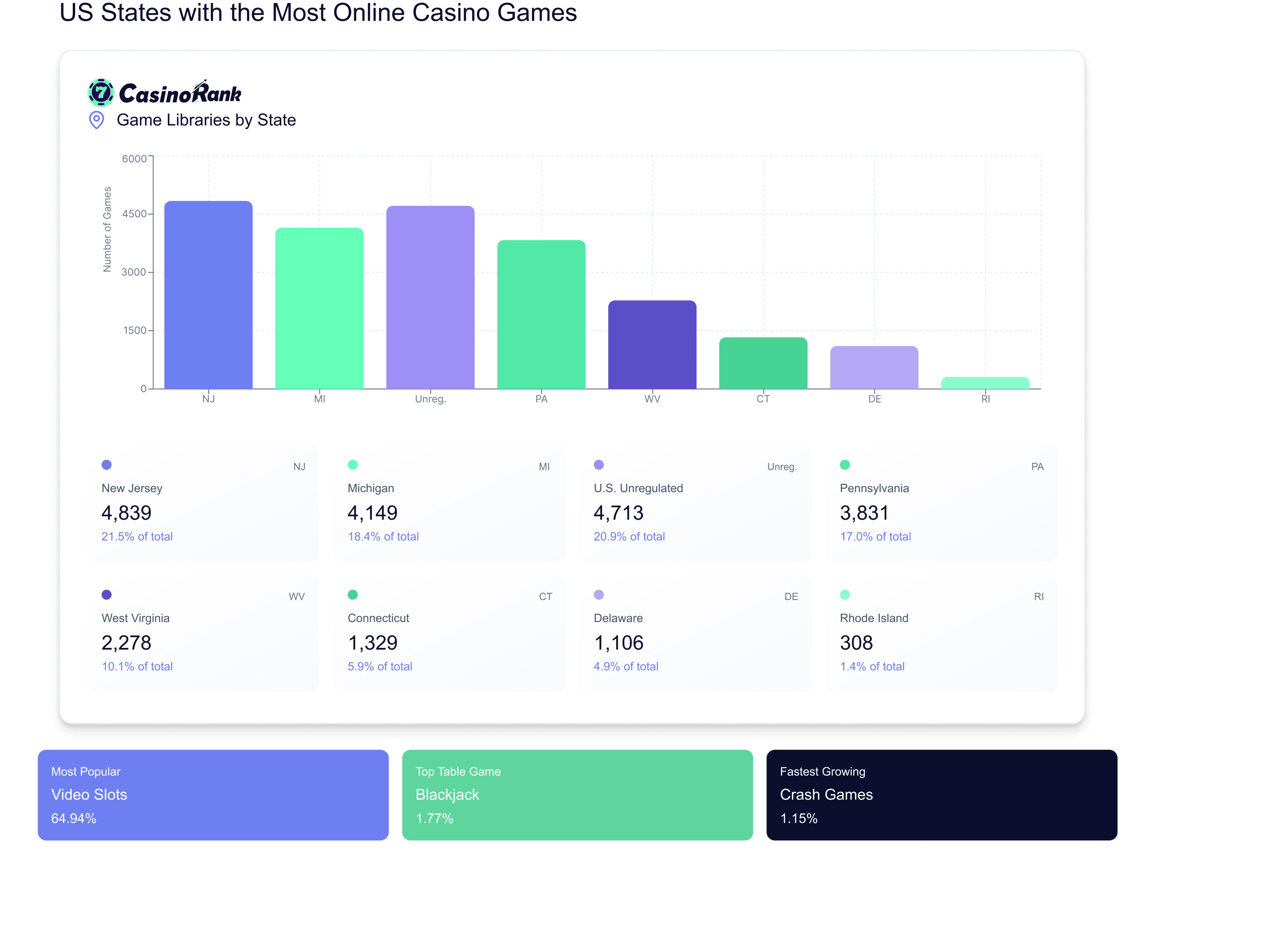 Despite these regulatory differences across states, gamblers’ preferences remain quite similar nationwide. Video slots lead the pack by a large margin, claiming nearly two‑thirds of all game content. Progressive jackpots and standard jackpot games follow, and while classic table games — like blackjack and roulette — remain modest but steady, newer formats such as crash games and game‑show‑style gambling are gradually gaining popularity.